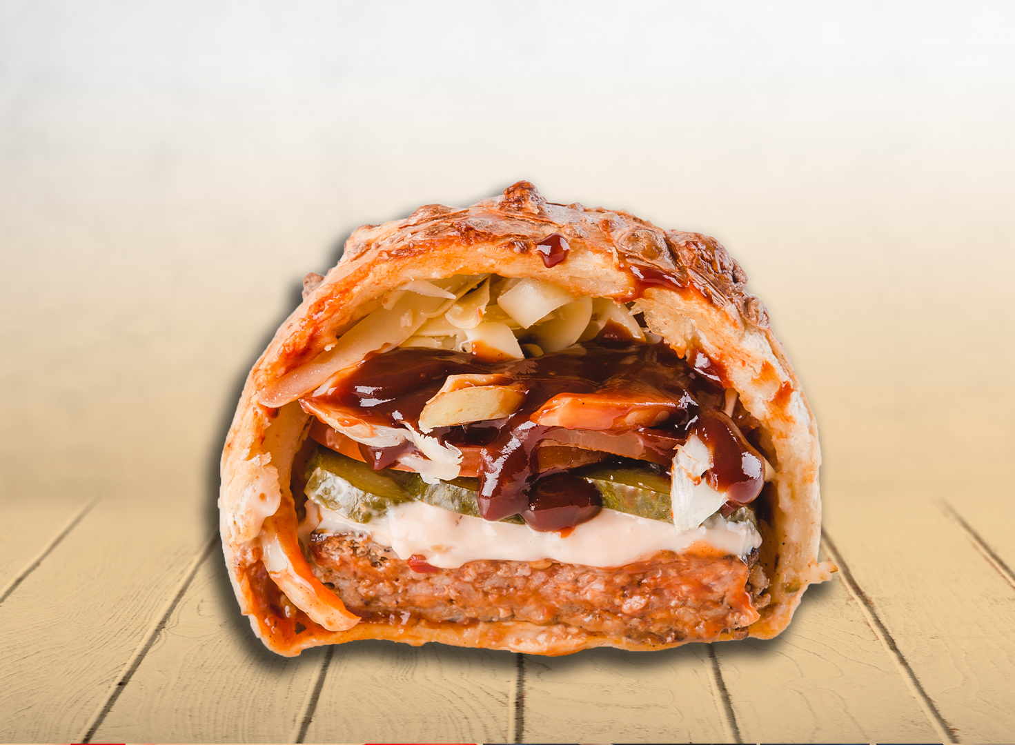 MONSTER BBQ BACON PIZZABURGER(marhaburger, pirított bacon, paradicsom, csemege uborka, BBQ szósz, cheddar sajt)